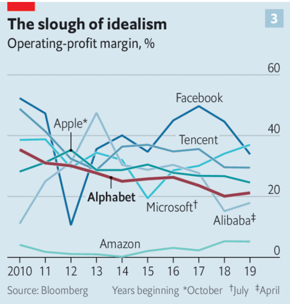 《经济学人》在对Google的深度报道中指出:“就像硅谷的抄写员之一史蒂文·列维(Steven Levy)在2011年所说的那样,只要Google的广告产品仍是“每一个敢于创新的金线安全网”,这一切都无关紧要。但与竞争对手相比,在利润率,股市表现上,创新能力Google都在退步。”