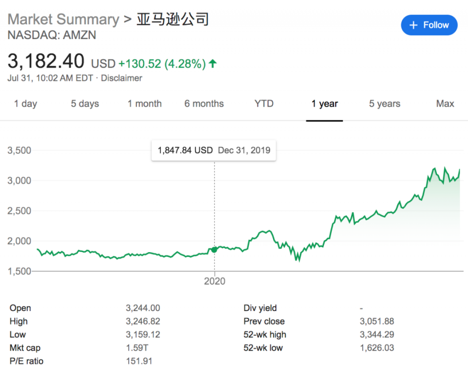 2020年上半场,最亮眼的公司当属亚马逊。我们看看这半年亚马逊的股价走势有多猛:股价从2020年1月初的1800美元直接蹿升到3200美元,增幅高达78%,市值逾1.5万亿美元,直逼2万亿而去。