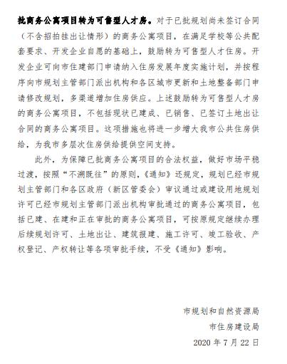 根据新政,鼓励已批商务公寓项目通过申请修改规划转为可售型人才住房,但也要看开发商是否自愿。