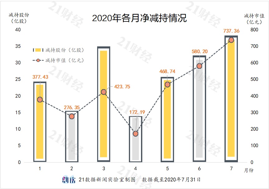 7月大盘开始上行,市场活跃,23个交易日中有20个交易日成交额突破万亿,股东减持金额也创出年内新高。