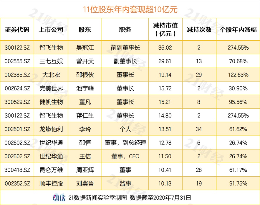 11位个人股东套现逾10亿元
