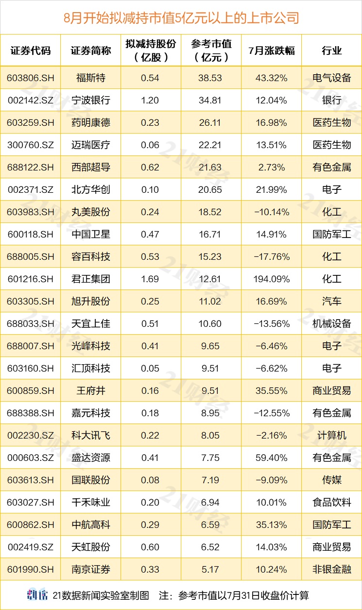 7月A股大涨后,多家上市公司抛出减持计划。