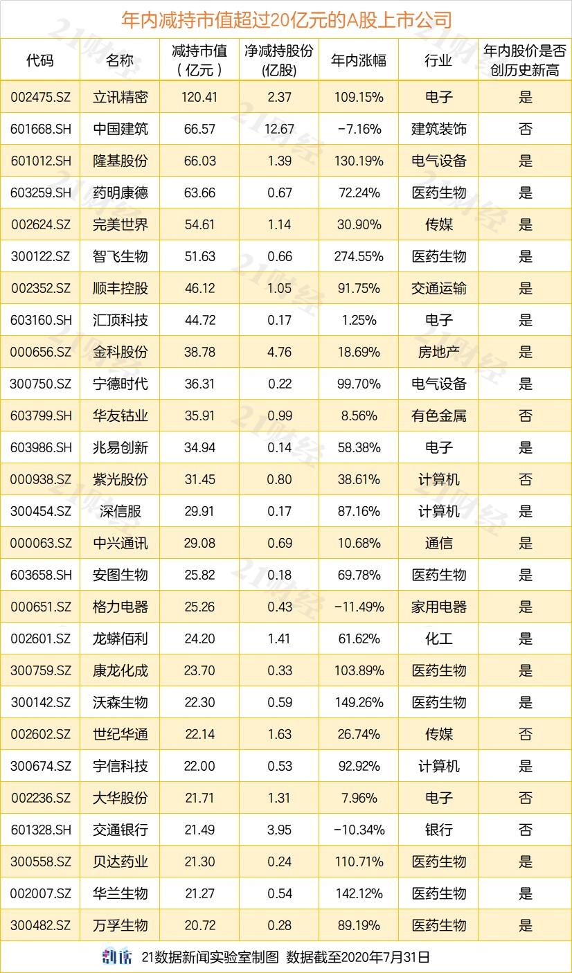 据21数据新闻实验室统计显示,60家上市公司净减持超过10亿元,其中42家公司年内股价创出历史新高,15股股价今年涨幅已超过100%;超过20亿元的有27家。立讯精密(002475.SZ)今年来减持市值达120亿元。