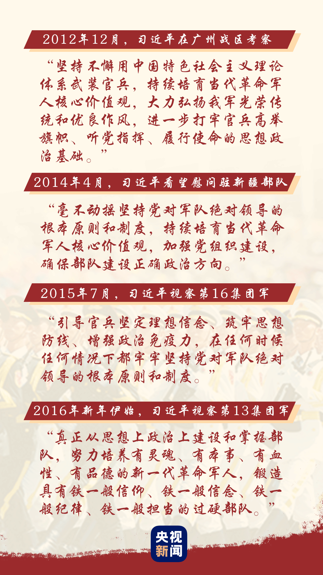 从北国边疆到岭南大地,从大漠戈壁到东海之滨,无论走到哪里,习主席都对铸牢军魂反复强调、再三叮嘱。