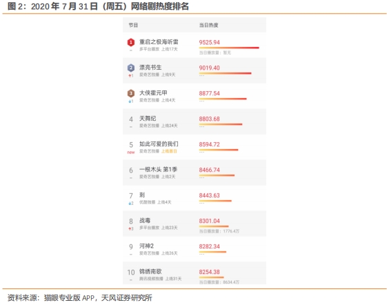 根据猫眼数据,2020年7月31日(周五)网络剧热度前三分别为:由爱奇艺、浙江天猫、南派泛娱、霍尔果斯南派文化出品的《重启之极海听雷》排名第一;由爱奇艺、北京华语出品的《漂亮书生》排名第二;由爱奇艺、完美世界、完美建信出品的《大侠霍元甲》排名第三;