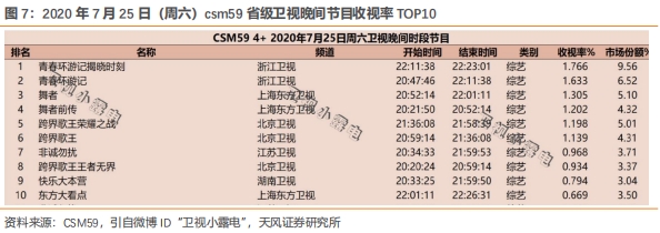 2020年7月25日(周六)csm59省级卫视晚间节目收视率前三:《青春环游记揭晓时刻》(浙江卫视1.766%)、《青春环游记》(浙江卫视1.633%)、《舞者》(上海东方卫视1.305%)。