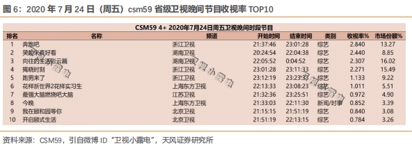 根据微博ID“卫视小露电”提供的数据,2020年7月24日(周五)csm59省级卫视晚间节目收视率前三:《奔跑吧》(浙江卫视2.840%)、《笑起来真好看》(湖南卫视2.440%)、《向往的生活彩云篇》(湖南卫视2.307%)。