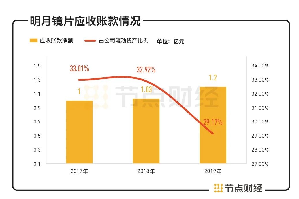 不过,随着营业收入的增高,明月镜片的应收账款也持续增加。2017-2019年,明月镜片应收账款净额分别为1.0亿、1.03亿和1.2亿,占公司流动资产的比例分别为 33.01%、32.92% 和 29.17%,金额呈上升趋势。应收账款是伴随企业的销售行为发生而形成的一项债权。也就是说,明月镜片持续增长的收入形成了部分应收账款,应收账款不仅会影响公司现金回流,还为业绩真实性蒙上阴影。