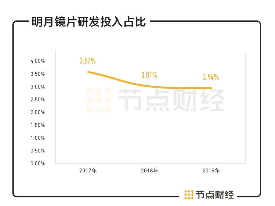再看明月镜片的销售和研发能力。虽然明月镜片表示,“公司一直十分重视提升技术研发能力,经过多年的技术积累与研究开发,公司掌握了镜片行业的诸多核心技术, 拥有一系列发明、实用新型专利及专有技术,其中部分技术在行业内处于领先地位。”但从研发投入上看,有些言过其实。