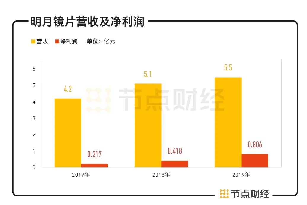 明月镜片招股书显示,2017-2019年度,明月镜片营业收入分别为4.2亿、5.1亿、5.5亿。2017-2018年营业收入的快速增加,与当时这一战略不无关系。