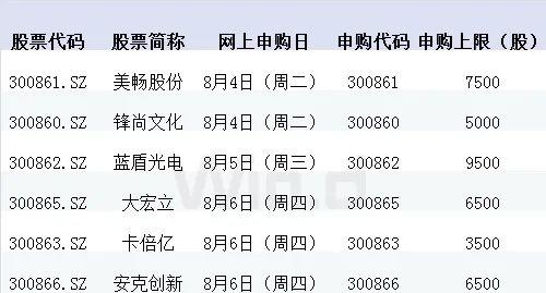 从8月4日(周二)开始,美畅股份、锋尚文化将作为首批创业板注册制新股进行申购。蓝盾光电将于8月5日(周三)申购,大宏立、卡倍亿、安克创新将于8月6日(周四)申购。