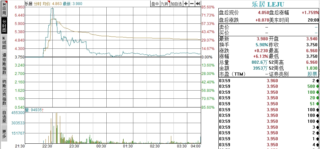 美股上市的乐居从昨晚10:10:04恢复交易开始,上演惊心动魄的一幕,短短不到20分钟,股价发生6次熔断,一度暴涨82.67%,然后又大幅回落,收盘涨幅收窄至6.13%。