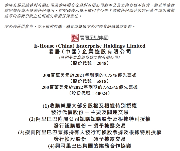 在此基础上,双方还签署可转股票据认购协议。据此,阿里将认购易居本金为10.319亿港元、三年期、利息每年2%的可转股票据,票据转股价为每股10.37港元。若该等可换股票据全部转股,阿里持有易居股份比例将提升至大约13.26%,跃居第二大股东。