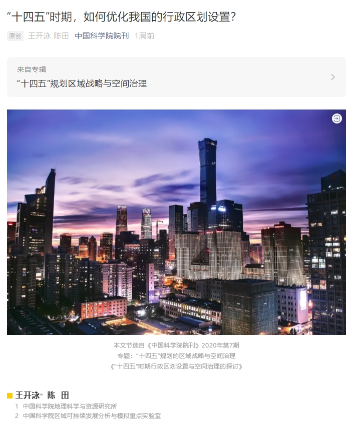 今天,发表于《中国科学院院刊》上的一篇名为《“十四五”时期行政区划设置思路与空间治理的探讨》的文章,有一句话被扒出来,如雷贯耳。