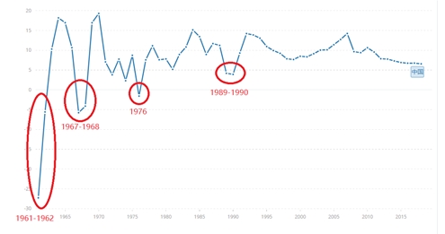 这是宁南山总结的自中华人民共和国成立后,中国GDP的波动情况。