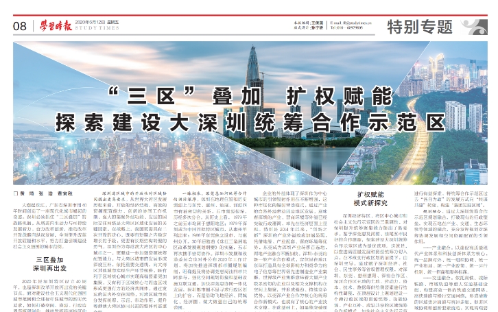 6月12号,中央党校主办的《学习时报》整版发表了标题为《“三区”叠加,扩权赋能,探索建设大深圳统筹合作示范区》的特别专题文章。