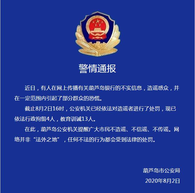 8月2日当天,葫芦岛公安发布警情通报称,近日有人在网上传播有关葫芦岛银行的不实信息,造谣惑众,并在一定范围内引起了部分群众的恐慌。截至8月2日16时,公安机关已经依法对造谣者进行了处罚,现已依法行政拘留4人,教育训诫13人。