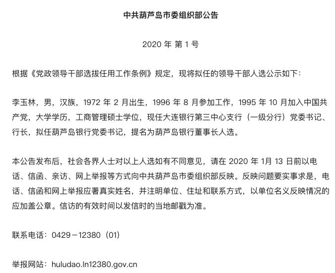 8月2日,葫芦岛银行在其官网发布公告称,该行原行长王学伶因个人涉嫌严重违纪违法,目前正接受纪律审查和监察调查。经市委批准,党委书记李玉林同志主持葫芦岛银行全面工作,副行长李晓东代理行长职责。