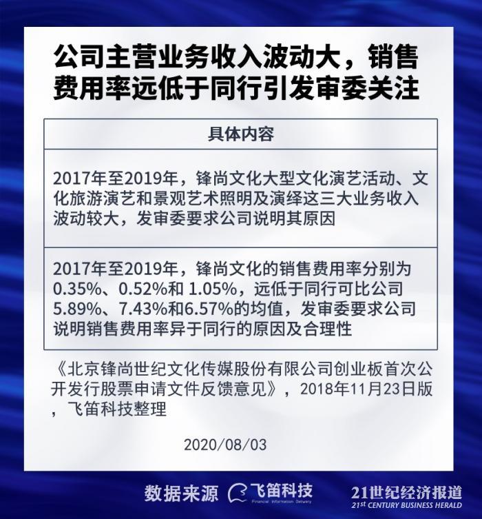 此外,锋尚文化销售费用率远低于同行问题也引发了发审委的关注。据公司最新招股书,2017年至2019年,锋尚文化的销售费用分别为72.43万元、298.09万元和953.21万元,占营业收入的比重分别为0.35%、0.52%和1.05%。可同行可比公司(宋城演艺、风语筑、华凯创意、华奥传媒)的销售费用占营业收入的比重均值分别为5.89%、7.43%和6.57%,公司销售费用率远低于同行可比公司水平。因此,发审委要求公司说明销售费用率异于同行的原因及合理性。