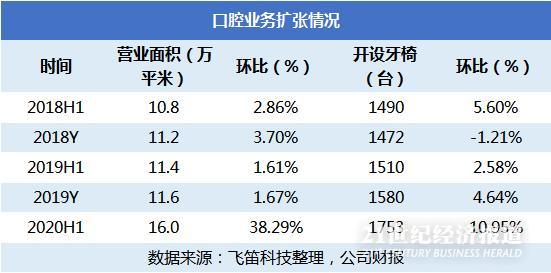 公司中报中,还公布了口腔医疗服务的门诊量、经营面积和开设牙椅数量。