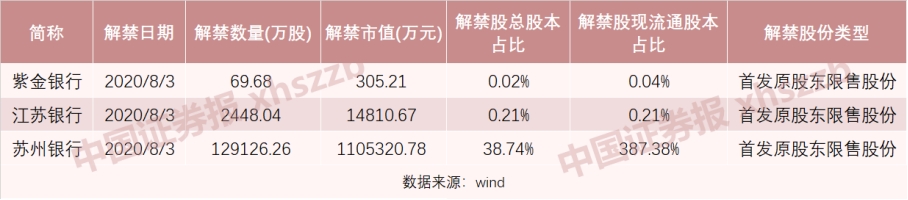 数据显示,苏州银行、江苏银行、紫金银行三家银行8月3日上市流通的解禁股份合计为13.16亿股。以7月31日收盘价计算,解禁市值合计高达112.04亿元。其中,苏州银行一家解禁市值便超百亿,其解禁股占现流通股本比例为387.38%。这意味着,苏州银行的流通盘激增近400%。
