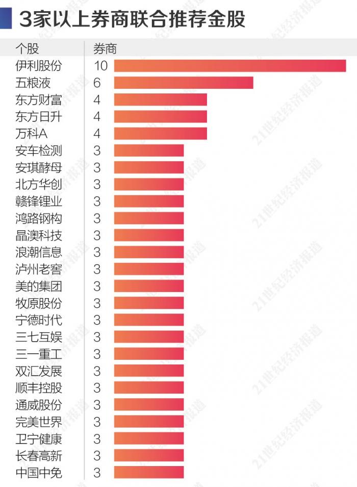 从个股来看,获券商联合推荐最多的三只个股分别是:伊利股份(10家)、五粮液(6家)、东方财富(4家)。