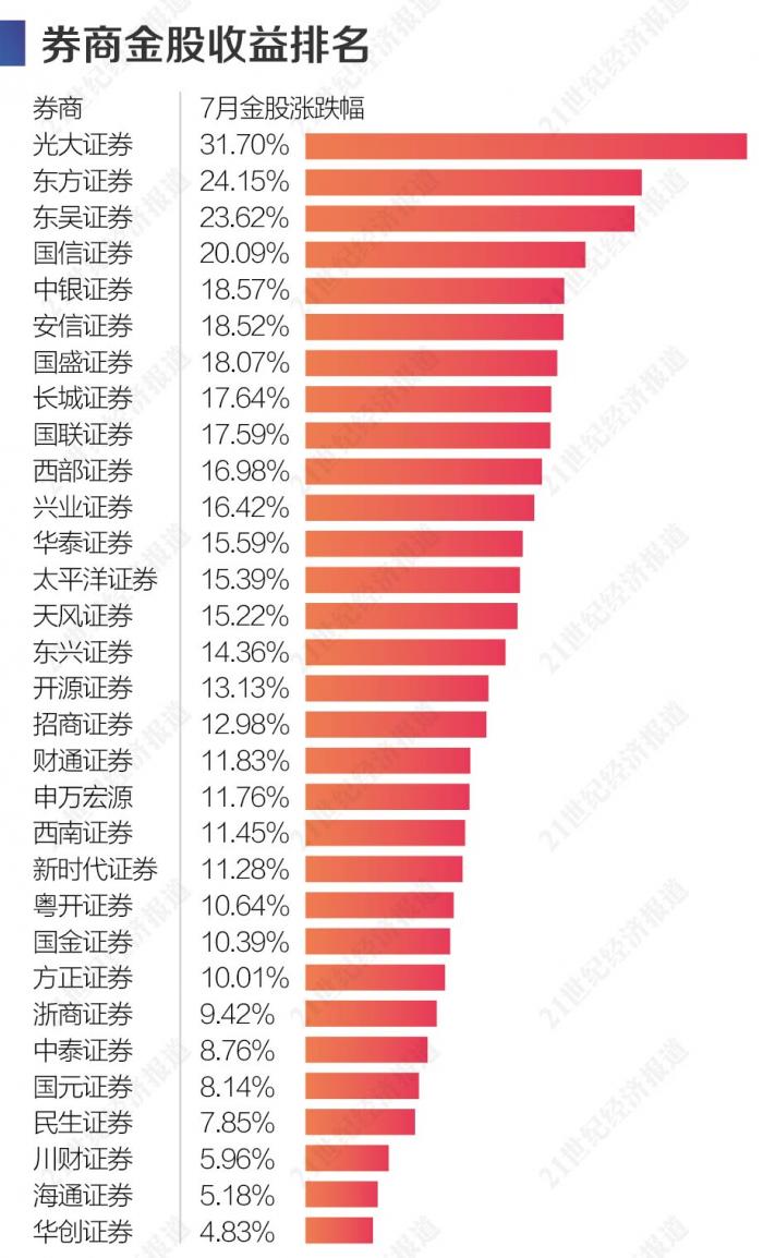 中芯国际的大幅上涨,使得荐股的光大证券7月金股组合平均收益位列31家券商平均收益第一。7月,光大证券金股组合平均收益31.70%,遥遥领先排在其后的东方证券(24.15%)、东吴证券(23.62%)。