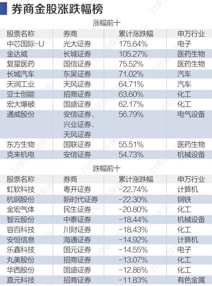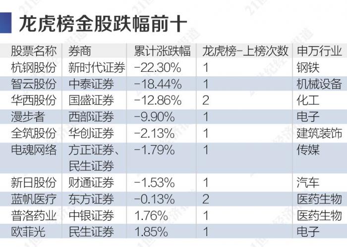海通、华创双双垫底,川财、民生、国元跌幅榜前十金股拉低收益