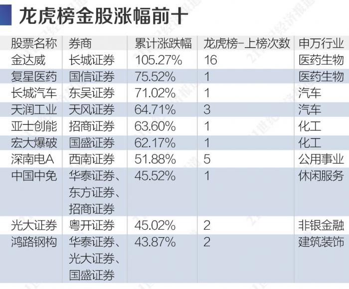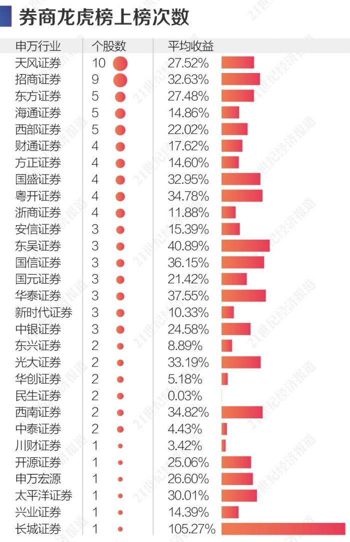 紧随其后的是招商证券,共有9只个股冲上龙虎榜,平均收益32.63%,领先于天风证券。其中,东方日升和东方财富月内分别2次冲上龙虎榜,另有7只个股分别上榜1次,分别是:惠达卫浴、威华股份、天坛生物、中航机电、春风动力、中国中免、亚士创能。