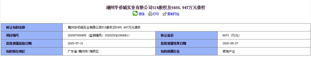 7月31日,华侨城拟转让潮州华侨城实业有限公司(简称“潮州华侨城实业”)51%股权及5455.947万元债权,转让底价6873万元。