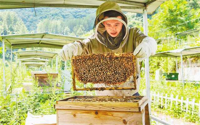 △石柱县中益乡,蜂农查看蜜蜂生长和产蜜情况。