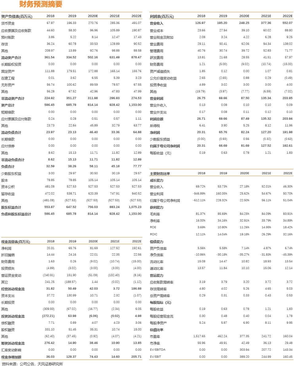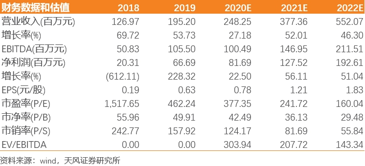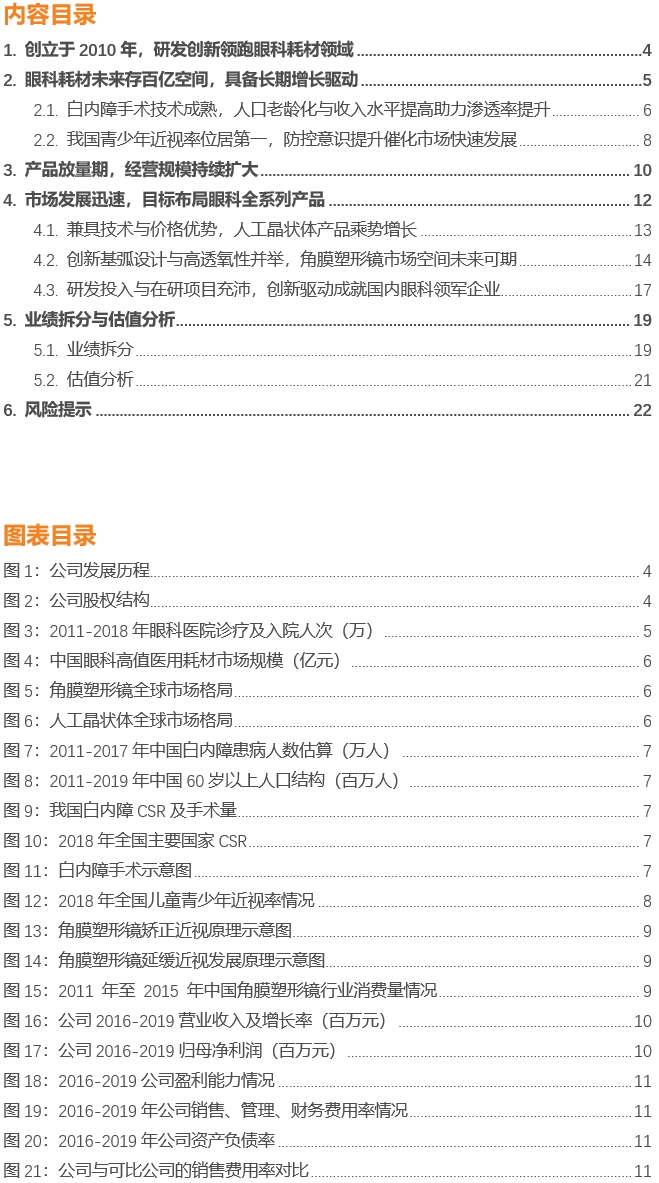 眼科耗材领域市场增长至速度以及渗透率提升速度来看,行业的增长均较快。公司作为该领域的研发领军企业,产品竞争能力强,且成长性高。我们预计公司2020-2022年归母净利润为0.82/1.28/1.93亿元,综合市值在323-334亿,目标价格307-318元,首次覆盖给予“买入”评级。