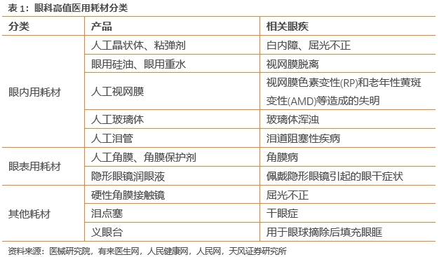 不同的眼疾治疗手段不同,手术与耗材主要用于白内障、屈光不正、青光眼等眼科疾病的治疗。眼科属于高精尖学科,对材料和技术的精细化程度要求高,包括人工晶状体、人工视网膜、人工角膜、硬性角膜接触镜在内的高值医用耗材用于眼疾治疗。