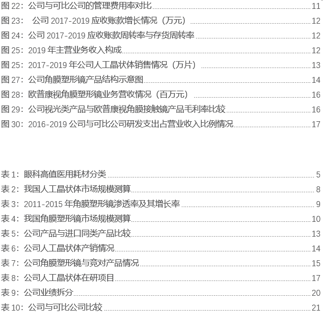 公司在研管线储备充足,紧跟国际厂商高端产品技术趋势。公司积极布局高端产品,开展多焦点人工晶状体、有晶体眼人工晶状体、大景深人工晶状体、硬性透氧性角膜接触镜(RGP)等产品及手术与视光领域配套产品的研发。公司研发的RGP已获得产品注册;多款高端人工晶状体处于临床试验阶段,我们判断多焦人工晶状体预计于2021年上市,有晶体眼人工晶状体(PR)的研发有助于打破国外品牌在该领域的垄断,预计于2023年上市。