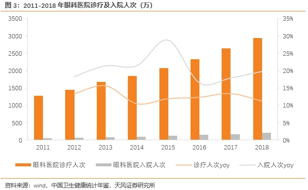 而我国眼科疾病领域的问题同样不容忽视。受到我国老龄化程度加深、生活方式改变、工作强度增大、过敏源增加、用眼不当等各类因素的影响,青光眼、白内障、视频终端综合症、干眼症、角结膜炎等眼疾患病人数增加,对眼科治疗需求不断增大,2018年眼科医院诊疗人次达到2932.4万,同比增长11.3%。