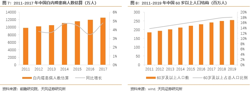 白内障是一种年龄相关性较高的眼科疾病。据2018年屈光性白内障手术新进展国际会议公布的数据显示,我国60岁至89岁人群白内障发病率约为80%,90岁以上人群白内障发病率高达90%以上。2019 年我国白内障的患病人数高达 1.84 亿。2011-2019年,我国60岁以上人口占比从13.7%增长至18.1%,未来,中国将加速步入老龄化时代,白内障患者人数呈现稳步增加的趋势。
