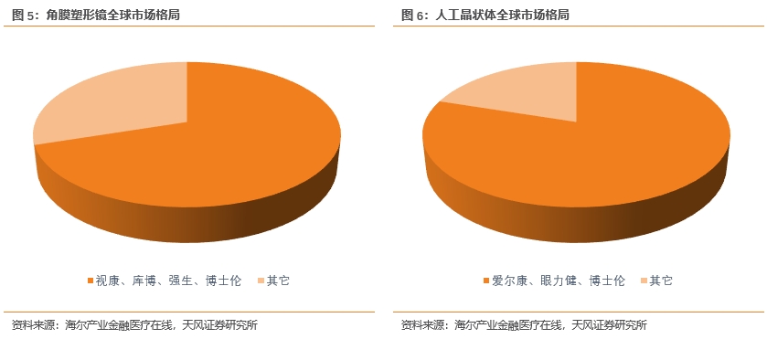 以人工晶状体与角膜塑形镜为代表眼科耗材属于III类医疗器械,行业技术和品牌壁垒较高,目前基本由外资品牌垄断。角膜塑形镜全球市场70%以上份额被视康(爱尔康旗下)、库博、强生和博士伦4家占据,人工晶状体全球市场80%以上份额由美国爱尔康、眼力健(雅培旗下)和博士伦3家占据。