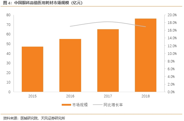 据医械研究院统计,2018年我国眼科高值医用耗材市场规模约为76亿元,同比增长16.92%,近三年均保持了双位数的快速增长。我们判断随着人口老龄化的提升以及电子产品普及等,眼疾病的需求还将进一步提升,眼科耗材行业景气度持续向上。