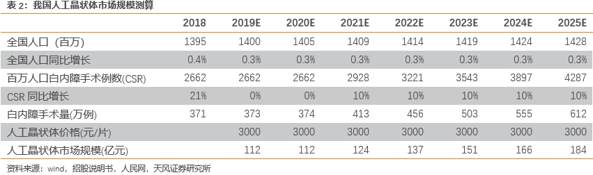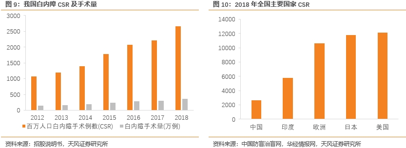 预计2025年我国百万人口白内障手术率(CSR)将超过4000,白内障手术总量将会达到612万例,人工晶状体市场规模将达到184亿元。