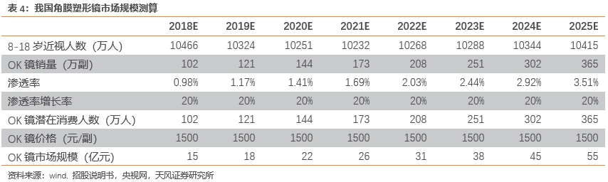 预计2025年角膜塑形镜渗透率将达到3.51%,潜在消费人数将达到约365万人,市场规模接近55亿元(出厂价口径)。