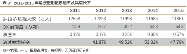 ③ 鉴于2011 -2015年选择角膜塑形镜治疗方式的比例增长率远超过20%,2015年后保守按照每年20%的增长率计算渗透率。