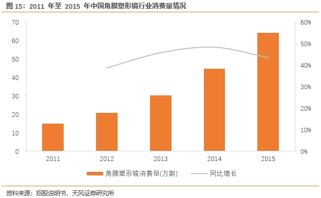 青少年近视率情况严峻,视力改善需求日渐突出,但角膜激光手术不适用于青少年,这使得能够延缓近视的角膜塑形镜快速发展。据中国医疗器械行业协会眼科及视光学分会统计,2015年我国角膜塑形镜销量达到64.30万副,2011年至2015年复合增长率约为44.11%。