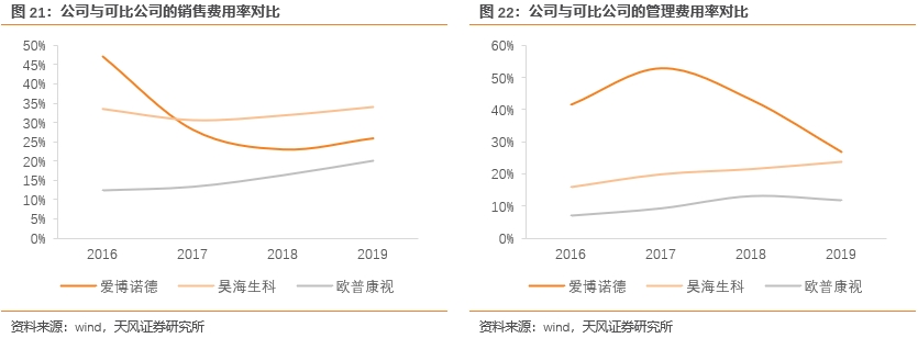 将公司与同业公司进行销售费用、管理费用的比较分析。爱博医疗的费用率处于较高水平,但有明显的下降趋势,昊海生科与欧普康视则比较稳定。销售费用率方面:昊海生科由于业务领域广泛销售费用率较高;爱博医疗明显高于欧普康视,我们判断主要是因为爱博医疗不断拓展销售渠道,而欧普康视经销渠道较为成熟。管理费用率方面:爱博医疗仍处于成长期,有较多的股权激励支付,因而管理费用率较高。