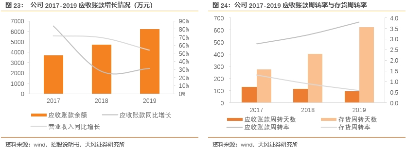 从营运方面来看,2017-2019年应收账款增长较快,但增幅小于营收增长,因此应收账款占营业收入的比例逐年下降,由49.34%下降到31.81%,应收账款周转率逐渐提升。公司销售模式中经销占比在60%以上,应收账款回款期限较短,质量较好。存货方面,公司存货周转率逐年降低,系公司销售规模扩大而增加原材料和产成品的储备所致,结合流动比率过高这一特点,认为公司的营运能力尚可但仍待提高。