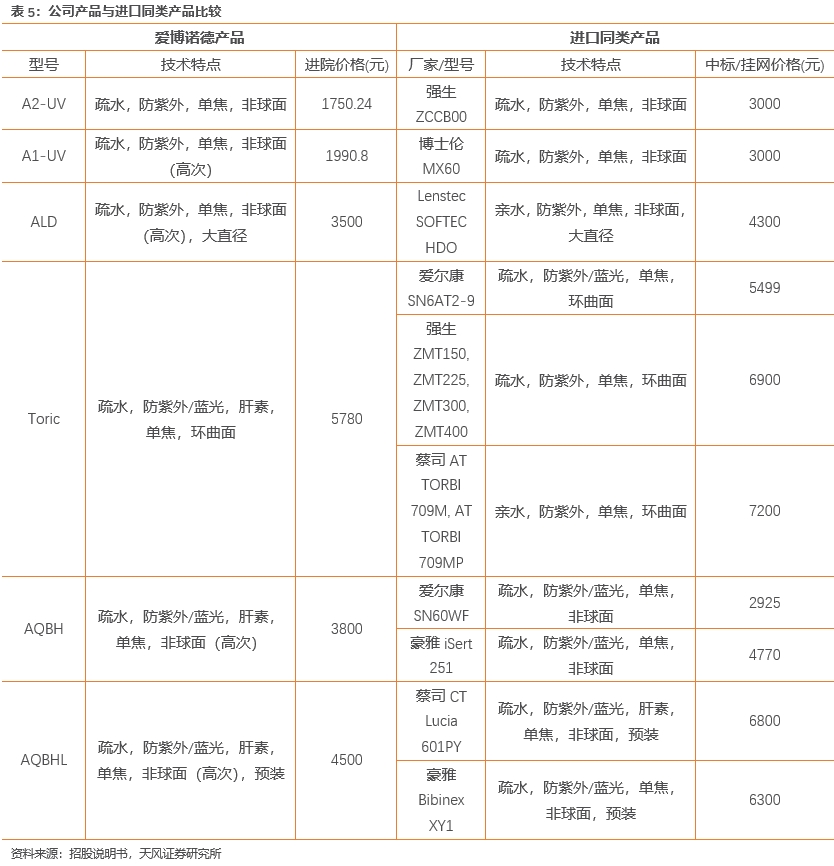 与国内注册的同行业产品进行对比,公司的人工晶状体在材料、结构设计、光学设计等方面具有较强的竞争优势,并且较进口同类产品价格更低。其中,普诺明Toric型号产品的环曲面设计用于矫正人眼散光,是唯一的国产散光矫正型人工晶状体。
