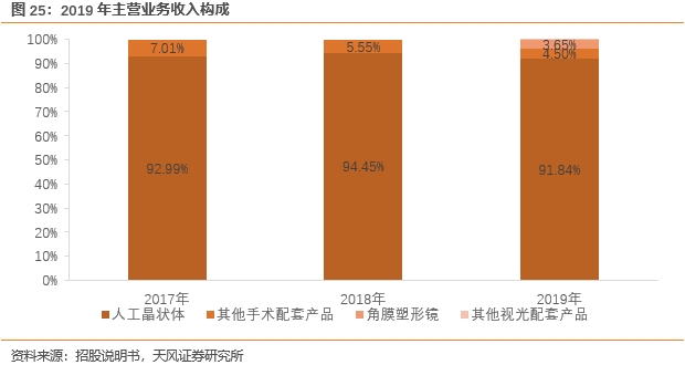 公司营业收入主要来自人工晶状体。人工晶状体自2014年7月上市以来已拥有 20 个产品型号,具有疏水、防紫外/蓝光、可折叠、非球面等特点,属于中高端晶状体,使白内障患者能够获得较高的视觉质量。公司人工晶状体市场发展迅速,2019年公司人工晶状体销售数量在国内市场占比10.28%,销售金额占比6.70%。