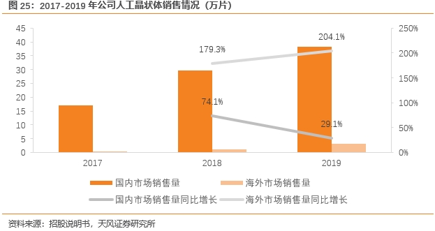 公司人工晶状体产品现已覆盖国内30多个省(自治区、直辖市)的1000多家医院,并且已出口至德国、法国、荷兰、意大利、奥地利、卢森堡、泰国、巴基斯坦等国家,累计销售近100万片。目前公司以国内市场销售为主,2019年海外市场销售量仅占7.7%,但海外市场呈现快速增长趋势。