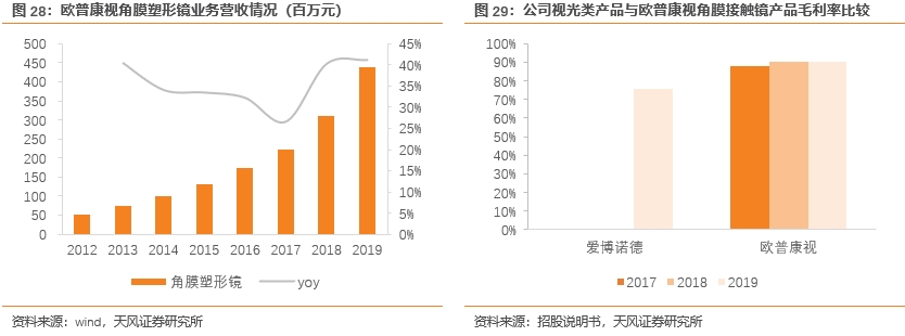 公司角膜塑形镜产品在公司已建立的眼科销售渠道快速开展市场推广和销售,2019年实现销售收入711.88万元。公司作为国内第2家获得角膜塑形镜注册证的生产企业,目前正处于成长期。对标国产角膜塑形镜龙头企业欧普康视,预计公司角膜塑形镜将快速增长。