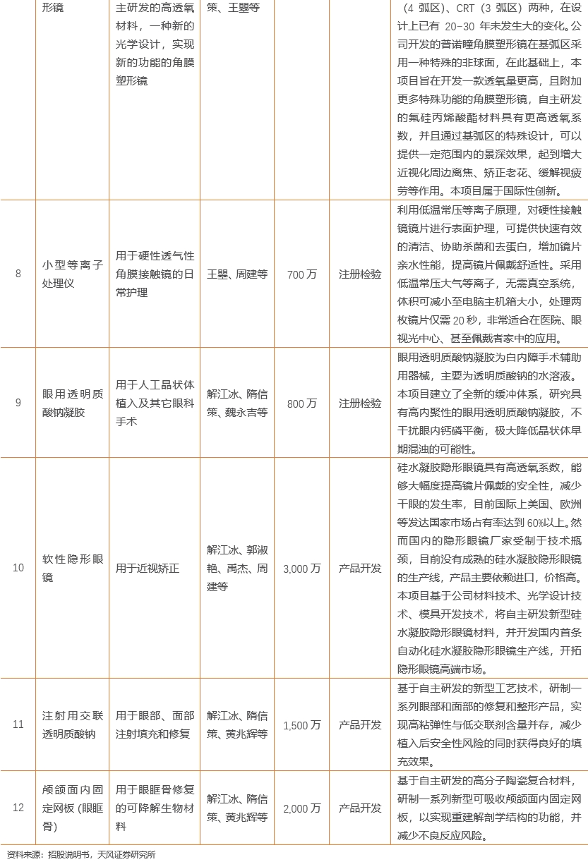 公司中长期目标是开发眼科全系列医疗产品,覆盖白内障、屈光不正、青光眼、眼底病等诸多领域。公司掌握人工晶状体的自主知识产权与核心技术,86项专利已获授权,在已有产品研发过程中形成的一系列平台技术,不仅可以用于现有产品的迭代更新,并且可向多方向延伸拓展,开发具有国际前沿技术水平的眼科医疗器械产品和其它医疗领域的产品。