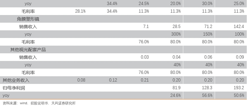 假设三:公司角膜塑形镜及其他视光配套产品上市时间短正处于成长期,且基数较低,预计2020-2022年增速大约为300%,150%,100%。
